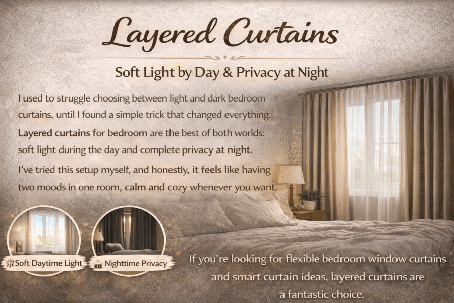I used to struggle choosing between light and dark bedroom curtains, until I found a simple trick that changed everything. Layered curtains for bedroom spaces give you the best of both worlds—soft light in the day and full privacy at night. I’ve tried this setup myself, and honestly, it feels like having two moods in one room, calm and cozy whenever you want.