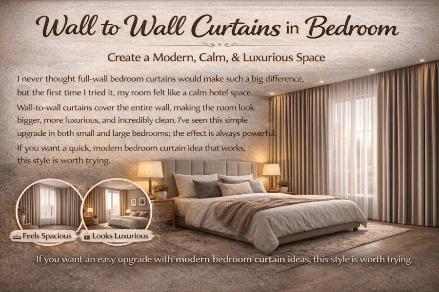 I never thought full-wall bedroom curtains would make such a big difference, but the first time I tried it, my room felt like a calm hotel space. Wall to wall curtains in bedroom setups cover the entire wall, and it instantly makes the room look bigger and more clean. I’ve seen this work in both small and large rooms, and the effect is always simple but powerful.